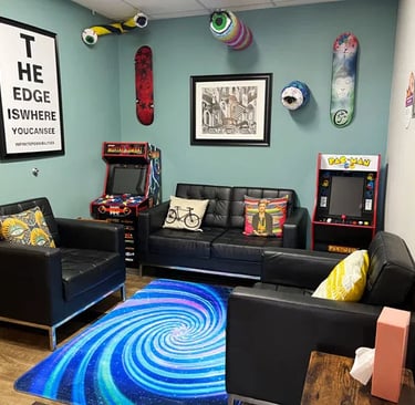 We know that a visit to the eye doctor can be daunting for kids, so we’ve created a fun and engaging Kids’ Corner to make their experience enjoyable. While waiting for their exams or for their parents to finish, children can play with a variety of tactile toys, including wooden blocks, trucks, and a dollhouse. They can also enjoy our 4-in-1 arcade games featuring classics like Mortal Kombat, Pac-Man, Rampage, and Galaga, as well as coloring books, puzzles, and a rock climbing cave under the stairs. Our Kids’ Corner is a place where children of all ages can have fun and feel comfortable.